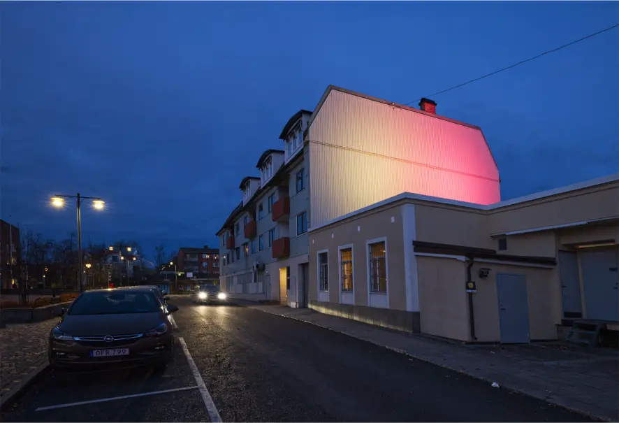 With the light artwork "Forgotten Walls," Maaria Wirkkala makes the insignificant noteworthy by pointing out forgotten surfaces in the urban space as darkness falls. With softly mixed colored light, she shapes areas that are not normally open to view, either due to their location or because they do not express themselves. Maaria Wirkkala's work aims to illuminate shadows, and by doing so, she establishes new relationships between people, places, and things. To see – to pay attention to something that one usually just passes by without noticing it.