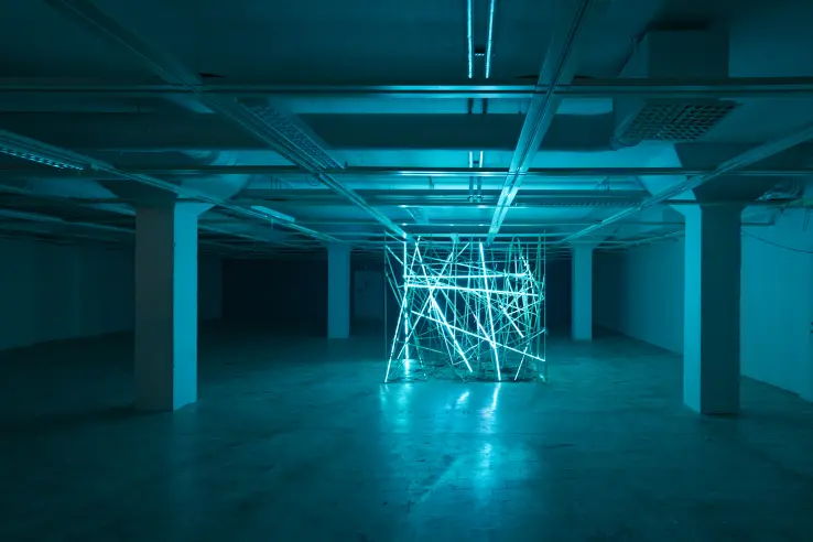 The Dutch collective Vendel & de Wolf creates immersive light installations to visually articulate the inherent beauty of the existing environment. They aim for plug-and-play installations with relatively simple and energy-efficient materials, which are executed with maximum effect. They are often inspired by phenomena of nature. For "Solid Void," it was the realization that on Earth, in an area the size of a fingernail, 65 billion neutrinos pass through our body every second. This idea led the artist duo to design an installation where blue light is woven in and out of spaces.