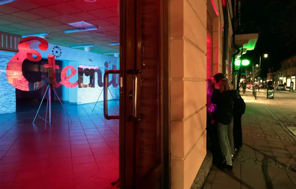 The work "Rising" is a custom repetitive sequence of falling water, projected across the length of the building at Ritz Parking. Tiainen made this work specifically for this location in Arvika to counteract the urban environment with this powerful natural phenomenon. Aside from the water's beauty and meditative qualities, there is a distant undertone of a second meaning of this waterfall, in our time of melting ice caps and rising water levels. Yet beauty and fascination for the water prevail where the water wave falls down in slow motion and softly hits the pavement.